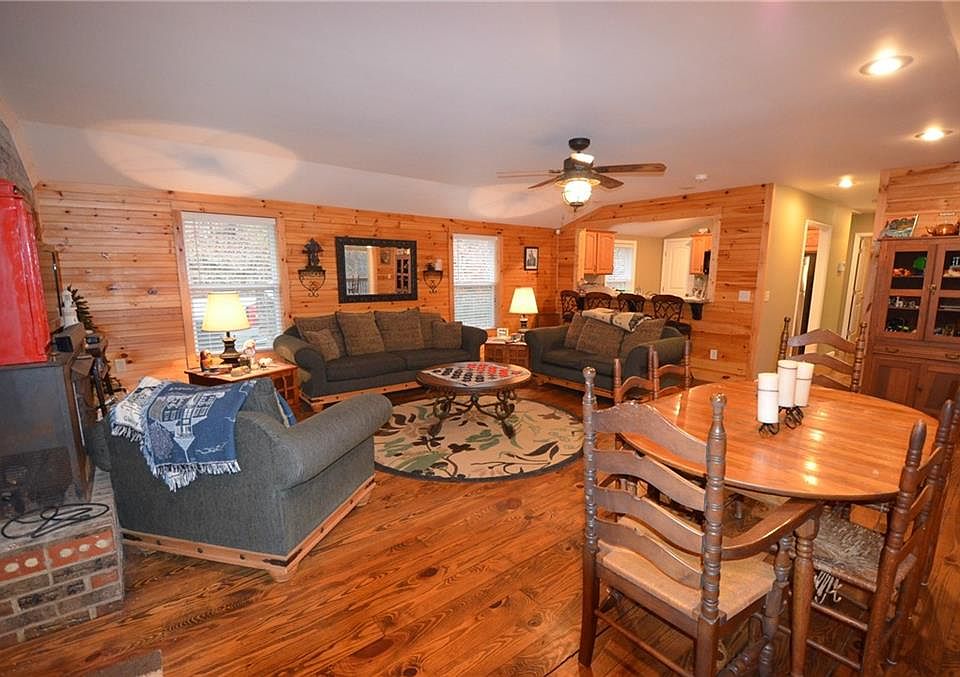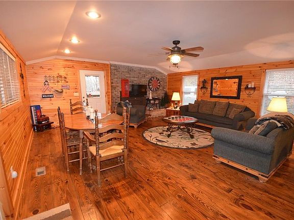 This little cottage was refurbished in 2011. Step into an open living/dining area with hardwood floors, pine walls and wood burning stove. The galley kitchen includes all appliances and has bar seating. Two bedrooms and one bath on the main level. A nice size screen porch is on the lake side. Access the lower level from outside back of home and what a nice surprise. Large living space, kitchenette, 19x13 bedroom and a full bath. Ideal for family/friends or rental investment. The HVAC is a 2 1/2 Ton Seer Split System Heat Pump. One unit with two separate air filters. A filter on each floor. Septic cleaned out in 2011. This home is nestled in the woods down a private driveway and sits on .77 acre. A platform dock sits on deep lake frontage. Verbal approval for maximum sized covered slip dock.