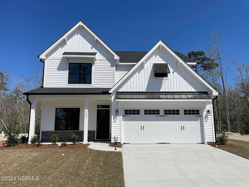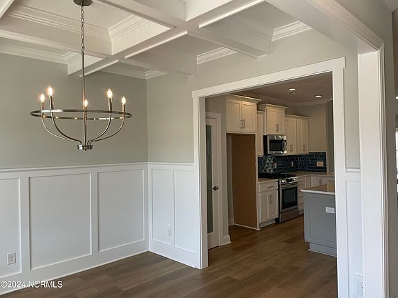 Introducing the Sea Breeze Plan by Hardison in the prestigious Sanctuary at Forest Sound community. This exquisite residence boasts four bedrooms, three and a half bathrooms, along with a generously proportioned second-floor loft. Spanning 2,400 square feet, this home epitomizes modern elegance. Step inside to discover a stylish dining room adorned with a coffered ceiling, perfect for hosting gatherings. It seamlessly flows into the open kitchen and living area, creating an ideal space for entertaining. The kitchen is a chef's dream, featuring luxurious quartz countertops, gleaming stainless steel appliances, and an oversized island that invites culinary creativity. The first floor is graced by the spacious owner's suite, complete with a tray ceiling. The spa-like bath showcases a fully tiled walk-in shower, double vanities and a generous walk-in closet. Additionally, the convenience of a laundry room on the first floor enhances your everyday living. Ascending to the second floor, you'll find three more bedrooms, two well-appointed bathrooms, and a versatile loft area, perfect for relaxation or recreation. Step outside to your spacious cover porch to enjoy your private yard. The sodded and irrigated yard provide a lush backdrop for outdoor enjoyment. This home boasts an array of desirable features that will elevate your living experience. Revel in the beauty of wide plank laminate flooring that graces the entire first-floor living area. Cozy up by the fireplace on chilly evenings, relish in the convenience of a gas range, and admire the elegant wood stair treads. Plus, enjoy the efficiency of a natural gas hot water heater. The Sanctuary at Forest Sound is strategically located in the heart of Hampstead, offering easy access to a host of amenities. Within a mere 15-minute drive, you can reach the vibrant city of Wilmington or the sandy shores of Surf City/Topsail. Moreover, you'll find yourself just one mile from the Intracoastal Waterway, a paradise for a boaters!