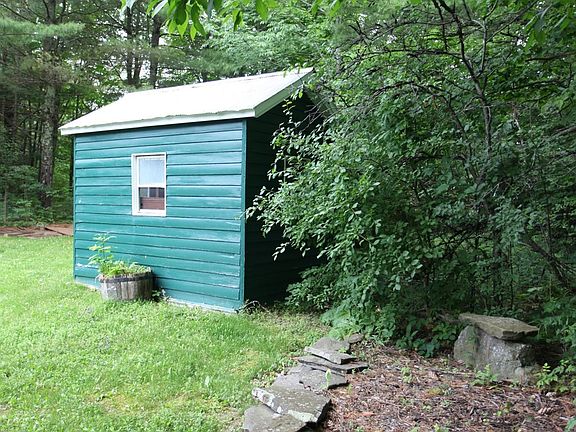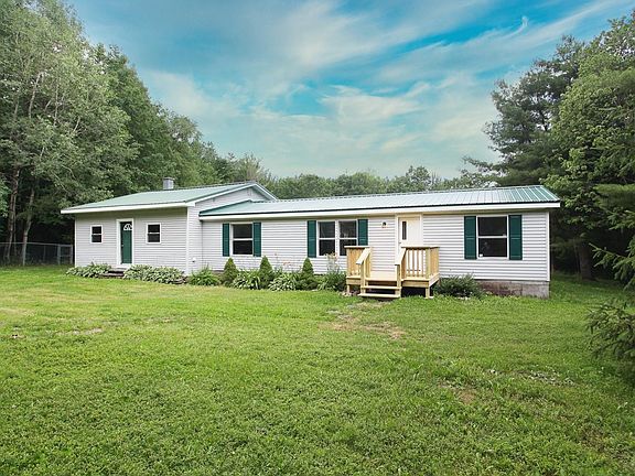 Spacious doublewide/stick built home, tucked into a very private location on 7.5 acres in Schoharie, foothills of the Catskills. Brand NEW Kitchen, brand NEW berber carpeting in family room and bedrooms. Large stick built (20x30) Family Room addition (2004) has wood beams and woodstove. Separate mudroom/laundry room with tons of storage space. Doublewide section on slab with 3 bedrooms, largest with private bath. Above ground pool with wrap around deck. New porches on front and back. 3 outbuildings: Large detached 2 car garage and small shed AS IS, other 14 x 14 outbuilding for storage/small animals. Borders NYS land and set back nicely off road.