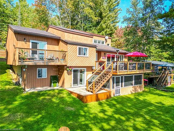 This is the one your family has been waiting for on highly sought out Trout Lake. 145 Viceroy Rd. is a one-owner home, Viceroy Build that suits all your needs with living on the lake and growing a family. There are 3 bedrooms on the main level, bright open concept kitchen/dining and sunken living room. Vaulted ceilings throughout. The primary suite features a private deck overlooking the Lake. The lower level features a 4th bedroom, bathroom with large sauna, a cozy family room with a gas stove, a bar room, and multiple access points to the lakeside yard. The home has seen numerous upgrades over the years including: windows, flooring, bathrooms, propane fireplaces, metal roofing, addition of the 1.5 car detached garage, retaining walls, paved driveway, terraced yard, steps down to the lake, and new docks. Soak in the amazing views from multiple decks and the Adirondack chairs overlooking your south-east exposure which will ensure sunshine all day in the summers. The mature tall pines will have you swooning. With 100 ft. of shoreline, your kids and grandkids will enjoy the sandy bottom and shallow waters near the dock, but can also make those cannon balls work at the end of the dock. Lots of toy storage on this lot, and parking for 4, nestled on a quieter street. Don't miss out on this unique opportunity on the shores of beautiful Trout Lake.