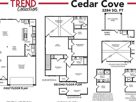 The Cedar Cove, part of the Trend Collection by Ball Homes, is a two-story plan with four bedrooms, all on the second floor. The plan offers a versatile flex area off the entry, and an open layout with a spacious family room. A fireplace is offered in the family room, and a covered patio at the rear of the home. The island kitchen offers both a dining area and countertop dining, and a pantry. The utility room is located on the first floor and serves as a pass-through mudroom from the garage to kitchen area. Upstairs are the primary bedroom suite, three bedrooms, a loft and a hall bath. The primary bedroom suite includes a bedroom with vaulted ceiling, large closet, and spacious bath with fiberglass shower, double bowl vanity, window, and linen storage. Front elevation includes a covered entry, offset window, and reverse gable design.
