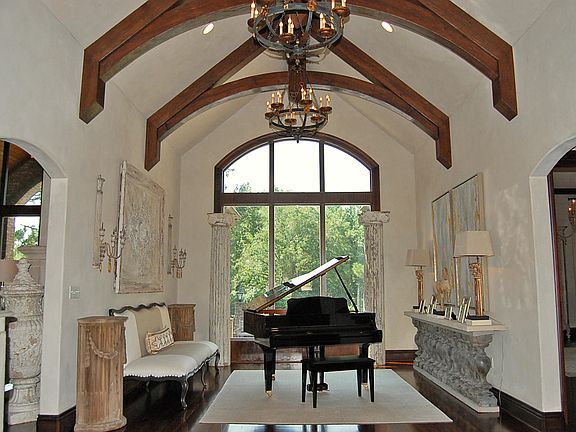 Exquisite Gothic Revival Custom Home by master builder Tony Holmes of Columbia. This unique architectural masterpiece is the result of four years of planning, designing, and collecting unique designer accents from around the world including authentic castle doors for the mancave, Gothic antique chandeliers, crema marfil marble countertops, fixtures by Restoration Hardware, distinctive octagonal kitchen island with hidden lazy Susans, quartz work island for the hobby room, 8' limestone antique mantle for the master bedroom, gold inlaid vanities for master bath and Venetian plaster walls throughout. Handsome custom window treatments are throughout the low-cost energy residence. Amenities include two separate 2-car garages plus an additional heated/cooled hobby garage or work-out gym space...