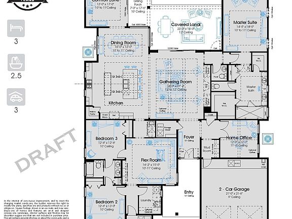 The Avalon is a 1-story home with 3,205 square feet, 3 bedrooms and 2.5 baths. A gracious entry welcomes visitors into the foyer and home office. The gathering room and dining room are both adjacent to the kitchen with views to the covered lanai. A large master suite with an elegant en-suite bath boasts a huge walk in closet. Two secondary bedrooms share a jack & jill bath and are adjacent the comfort zone that can be an additional bedroom or home office.