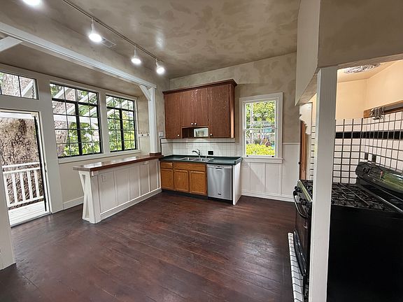 2 car parking secure parking! This spacious residence blends historic charm with modern functionality. Inside, you'll find rich dark hardwood floors, soaring 10-foot ceilings, and an airy, open layout. The updated kitchen features stainless steel appliances including a gas range, hood, microwave, dishwasher, and full-sized refrigerator plus handmade tile backsplash and a solid wood bar counter with seating, perfect for casual dining or entertaining. The bathroom has been tastefully renovated with a shower-over-tub design and ample storage. A dedicated laundry room with washer and dryer adds everyday convenience. Out back, enjoy a large fenced yard and raised deck ideal for relaxing or entertaining. But the real standout: a gated lot with secured parking for up to three vehicles an incredibly rare find in this part of the city. Just minutes to BART, Downtown Oakland, Emeryville, Berkeley, and the Bay Bridge, this location delivers exceptional connectivity to the entire Bay Area paired with the space, style, and secured parking that make it truly unique.