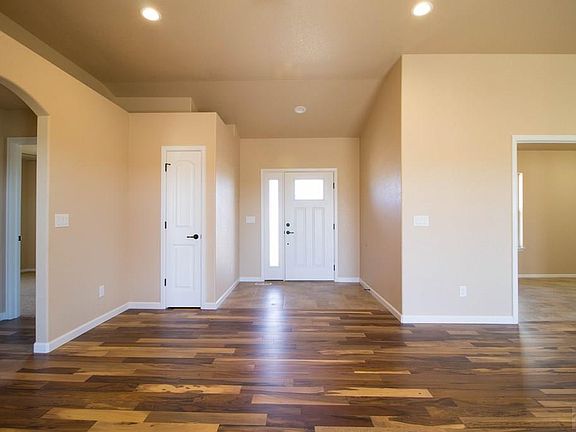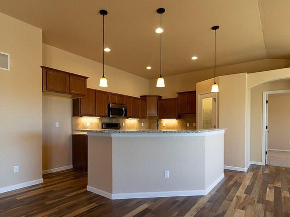 This bright open split floor plan features 3/4" solid Brazilian Pecan hardwood in great room, kitchen and dining area and tiled landings by all entry doors. Two tone paint. The kitchen sparkles with granite countertops, tiled backsplash above black granite composite kitchen sink, LG stainless steel appliances (including smooth top electric range, dishwasher & microwave hood) and spacious corner pantry. The secluded master bedroom has Stainmaster carpet, ceiling fan, big walk-in closet, boxed bay with dimmable recessed lighting. Master bathroom features dual vanities, tiled flooring, custom tile from floor to ceiling in the walk-in shower with frameless glass enclosure. The 2 bedrooms feature Stainmaster carpet, ceiling fans and ample closet space. The bathroom features granite countertops, tub/shower with custom tile floor to ceiling. Built to latest energy code, 2x6 all exterior walls on 16" center, blown insulation for R24, double wrapped crawlspace wall R22, attic blown to R49, 2.5 ton 13 SEER central air, Jeld-Wen Low E Argon filled energy saving windows, upgraded therma-tru front door and patio door, synthetic stucco. 3 car insulated R11 walls, R19 ceiling, sheetrocked/firetapped. Covered front porch, 12.6'x14' covered back patio. Upgraded birch shaker style cabinet, oil rubbed bronze faucets, LED lighting inside/out, tiled mudroom, decorative stone and much more.