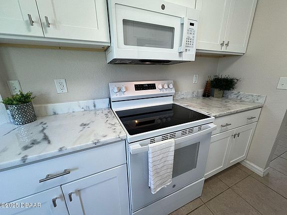 For Lease! Beautifully updated 2-bedroom, 1-bath home on desirable John Anderson Drive in Ormond by the Sea, just half a mile from the beach and Publix Shopping Center! This charming residence features tile flooring throughout for easy maintenance, and a brand-new galley kitchen with white cabinets, quartz countertops, and white appliances including a glass-top range, over-the-range microwave, dishwasher, and refrigerator with bottom freezer. The open living space allows for flexible furniture layout, and a sunlit rear bonus room offers additional space for dining, a home office, or lounge. The updated bathroom includes a sleek quartz vanity, white glazed tile tub/shower combo, and comfort-height toilet. Both bedrooms feature ceiling fans, mirrored closet doors, and plenty of natural light. A new HVAC system (2024) keeps the home comfortable year-round. Out back, enjoy a concrete patio and spacious grassy yard, with private parking off quiet River Lane. Washer/dryer hookups are located in the utility room. Lawn service is included in the rent. Pet-friendly (dogs only) with additional pet fee. Lease is $2,200/month for a 12-month term, with flexibility for shorter leases at adjusted rates. Need more room? An optional 11' x 20' bonus space is available for $200/month.