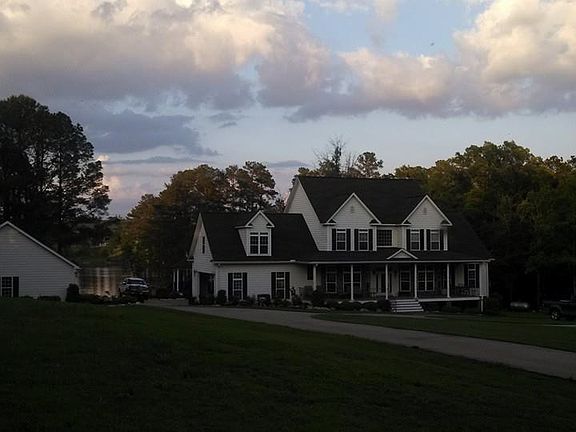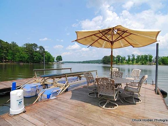 Waterfront, custom 4 bedroom, 4.5 bath 4300SF home on an incredible 4.95 acre lot. Lake view of cove and main part of lake. Home has private pond in front along with extensive infrastructure upgrades (additional supports, french drains, etc). Extensive porch gives views of the main channel and over 500 feet of water frontage. Water amenities includes full dock and a private beach area. Guest home has 1200SF with its own kitchen, full bath and attached, heated garage.