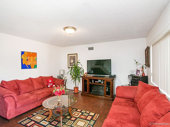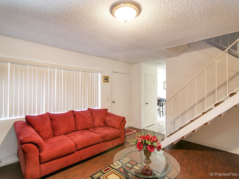 Great starter home for 1st time buyers. Spacious unit features new wood laminate flooring throughout living-room, dinning area and breakfast bar off kitchen. Lots of storage available. Full size washer & dryer located upstairs in hall closet. Large private patio. Complex features 2 community pools and basketball court. Home is centrally located near freeways and shopping centers.