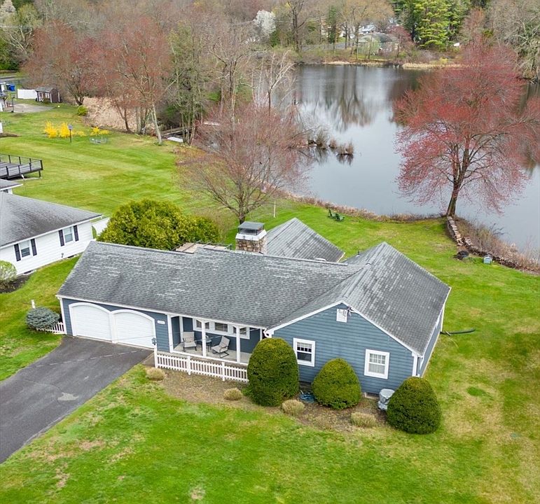 OWN YOUR VERY OWN WATERFRONT RETREAT! Serenity awaits at this waterfront paradise on almost 1/3 ACRE lot on MILL POND. Relax & be captivated by Nature as you sit on your deck shaded by the PERGOLA. Or sit at the front covered porch to unwind! This 6 Room RANCH has a vaulted ceiling multi use GREAT ROOM addition (2009). Many Home features: Wood/Ceramic/Vinyl Plank floors, center chimney FIREPLACE, Custon Kitchen by Kitchen Encounters, Granite counters, CRAFT MAID cabinets, slate tile from New Hampshire, Modern Updated Baths, Replacement Windows (some are PELLA), 2009 high efficiency BUDERUS boiler & timeless HardiePlank exterior siding. The lower level offers multi purpose space w/ Rec rm/GYM Room, Office, Craft Room, Bath,Laundry area & Workshop- perfect for a family member suite or Super Bowl watch party! There's also 2 Car Garage, ample driveway for basketball, Central Air, Updated Circuit Breakers, Spacious closets, solid 6 panel doors, & Ceiling Fans in BR's.