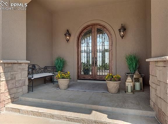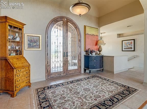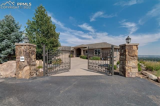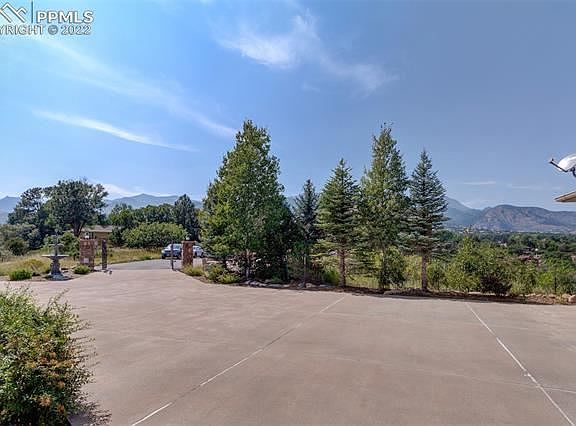 Step into house beautiful! Custom home w/ gated entry & spacious main level living. Located at end of a quiet cul-de-sac w/panoramic views of the city, Cheyenne Mountain & even Garden of the Gods. Large windows throughout the home capture the fantastic view from every room. As you approach the home, a covered front porch w/ tiled floor & double alder doors welcomes you. Step inside to a stunning great room that features a peaked ceiling, an expansive stone fireplace w/gas logs, newer carpet and big sliders to the view deck. The great room opens to the spacious dining room with cherry floors. Next to the dining room, the upscale kitchen has slab granite counters, cherry floors, a walk-in pantry & stainless appliances to include double ovens. Adjacent to the kitchen, there is a large laundry room w/tiled floors, a powder room and a mud room w/built-ins. Also on the main, there is an office, a guest suite w/private bath and the master suite. The master suite features crown molding, big walk-in closet with built-ins, soaking tub, double vanities and a walk-in shower w/glass block. The focal point of the walkout lower level is a big rec room with two distinct areas: a 15' x 16' pool table area and a 27' x 25' TV area with deluxe wet bar. The wet bar offers slab granite counters, dishwasher, disposal & raised counter seating. There is also a wine closet next to the pool table area. There are three huge bedrooms, an oversized craft room and two full baths (one with steam shower) on the lower level. The craft room has tiled floors, second laundry facility and ample storage. Additional special features include a big garage w/976 square feet, central vac, a fenced back yard for your dog, crown molding, cozy built-ins to include book shelves, window benches & art niches. All this, plus, the home is walking distance to all three schools.