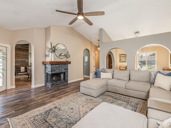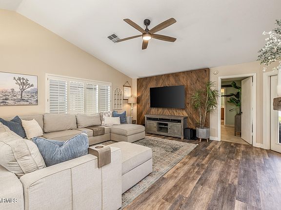 Discover this charmingly renovated Farmhouse-style home nestled on a cul-de-sac lot across from pickleball courts, basketball courts, a greenbelt and park. This home offers 3 bedrooms and 2 updated bathrooms within 1710 square feet of living space. The thoughtfully designed floor plan features a versatile front dining/flex area, a warm living room with a wood-burning fireplace, and a family room that flows seamlessly into the kitchen. The upgraded kitchen is equipped with shaker-style cabinets, sleek granite countertops, a classic subway tile backsplash, stainless steel appliances, a convenient pantry, and a breakfast bar perfect for casual dining. French doors lead out to an inviting backyard complete with an extensive travertine patio with pergola covering, and lush green grass for kids and pets to play on. The home's split bedroom design ensures privacy for the master suite, which includes a stylish barn door entrance to its en-suite bathroom, featuring a dual sink vanity, a separate bathtub and shower, and a generous walk-in closet. Additional highlights of this home are the custom feature walls, plantation shutters, durable tile and laminate floors, soaring vaulted ceilings, a practical inside laundry room with cabinets and shelving, and a two-car garage. Recent updates to the property include brand-new windows, a newer A/C system, a water softener, and much more.