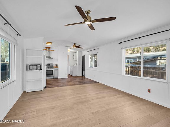 This is an ideal starter/retirement home nestled in a well-maintained mobile home park, conveniently located near downtown Flagstaff, NAU, I-17, and I-40, just off Route 66. Enjoy easy access to the city's vibrant downtown. The entire home boasts hard surface floors throughout, modern kitchen touches, and a stainless steel oven with a modern vent hood. Cozy 2 bedrooms are equipped with attached bathrooms, making it perfect for roommates. Fenced dog yard with an artificial grass patch. Fenced front yard with a shed. This is on a lease lot for 755.00 per month