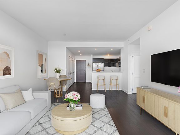 Residence 1101 at 1450 Washington at Hudson Tea is an exceptional south-facing one bedroom, one bathroom with private balcony that includes a 24-hour concierge, entrée to multiple gyms and a rooftop pool, free shuttle to-and-from Hoboken Terminal (PATH, Ferry, NJ Transit, Light Rail), as well as a covered garage parking space for one car. It is extraordinary for its open, flexible layout, unobstructed views south that encompass Jersey City, Lower Manhattan and The Freedom Tower, and its amenity-laden environs. This sublime setting offers unrivaled access to the Hudson River Waterfront Walkway, NY Waterway Ferry at 14th Street with service to Midtown, Brookfield Place and Pier 11, express bus to New York City, and is easily walkable to Trader Joe’s, Whole Foods, the Uptown farmers' market and an exciting array of boutique shopping, dining, coffee shops and parks/playgrounds that make The Mile Square City so special. With an open living/dining area that flows naturally from an updated kitchen with rich espresso millwork, quartz countertops, peninsula with bar seating and a full suite of stainless steel Bosch and KitchenAid appliances, Residence 1101 allows for uncompromised, easy living and effortless entertaining ensuring that you and your guests will experience home and life on the Hoboken waterfront like never before. The bedroom is outfitted with an oversized closet, while the bathroom showcases large format imported tile and Kohler Purist fixtures. Residence 1101 is further enhanced by hardwood flooring throughout, an in-residence washer/dryer, and two prodigious hallway closets. In addition to a 24-hour concierge and a dedicated, skilled service staff, 1450 Washington at Hudson Tea, along with its sister buildings, 1400 Hudson Street and 1500 Garden Street, offers residents and their guests superlative amenities, including: two fitness centers, rooftop pool, roof deck with fire pit and BBQ area, children's playroom, resident's lounge, free shuttle to-and-from Hoboken Terminal, and a variety of on-site retail and services. Monthly HOA fee inclusive of fee for covered garage parking space at the 1450 Bloomfield Street Garage. Some images are virtually staged.