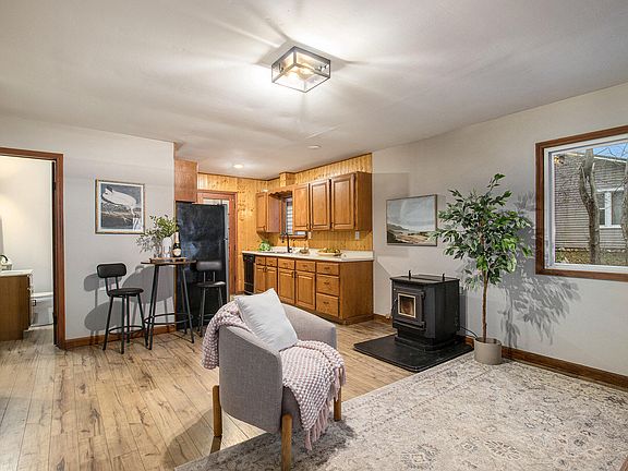 Step inside to a spacious 3-seasons porch that overlooks the lake, an ideal spot to relax or enjoy your morning coffee while taking in the views! From there, you enter the open-concept main living area, where the living room features a cozy wood stove! The living room flows past the eating area and into the kitchen, a functional and practical layout. The main floor also includes a full laundry room, a primary suite with a full bathroom, an additional bedroom, and a half bath.