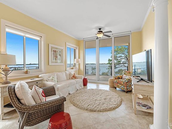STUNNING BAY AND SUNSET VIEWS FROM THIS 4 BEDROOM/3.5 BATH FURNISHED CORNER UNIT IN THE MOST LUXURIOUS BAYSIDE COMPLEX ON PERDIDO KEY! In addition to a gorgeous, nearly 2,400 square foot furnished unit, your new residence at La Serena includes a covered parking space and a climate-controlled storage unit. A deeded BOAT SLIP WITH BOAT LIFT is also available for separate purchase ($35,000). Luxury appointments include beautiful kitchen and bath soft-close cabinetry, granite countertops, stainless steel KitchenAid appliances, new KitchenAid icemaker, wine cooler, custom kitchen backsplash, floor to ceiling west facing windows in the living area, custom painted faux walls in the baths, open floor plan, 8-foot solid wood doors, crown molding and 10-foot ceilings. The oversized primary suite features private balcony access and an ensuite bathroom with rich wood cabinets, dual vanity areas, a walk-in closet with linens storage, separate shower, jetted tub & water closet. The three guest bedrooms have private or jack and jill bathrooms. Other features include an extremely upgraded, $20,000+ dual zone HVAC system which helps control utility costs, a whole home dehumidifier, an electronic air filtering system, a powder bath, and brand-new hurricane rated front entry doors. The very spacious, 300 square foot covered terrace provides awesome views of the Intercoastal Waterway, Ole River, & breathtaking sunsets. La Serena is a low-density, rent restricted community with only 51 units, including over 20 units that are occupied by permanent residents. The resort-like amenities include gated entrance, bayside pool & hot tub, cabanas, heated indoor pool & hot tub, sauna & steam rooms, fitness center, lighted tennis court, BBQ/picnic area, & kayak rack. If you purchase the boat slip you will be ONE OF ONLY 20 lucky owners with a DEEDED BOAT SLIP! Only a short walk to the Gulf beaches, a dog park is next door, and a boat launch and Arnold Palmer golf course are minutes away.