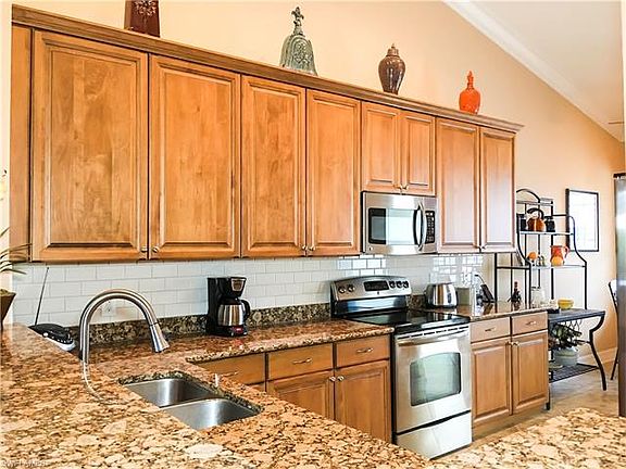 This designer furnished, turn-key condominium home has been perfectly remodeled & updated in 2011. Of course, it has a setting that optimizes quiet preserve treetop views with beautiful sunrises over the east facing lanai. This 1508 finished sq. ft home shows like a new model, clean and bright with angled large tile and crown molding. The innovative kitchen design is fabulous with gorgeous new cabinets, newer appliances, new counters and updated can lighting. Two spacious bedrooms & den, 2 remodeled baths with newer counter tops and new light fixtures. As you step into the dining room & family room the picturesque views captivate you, framed by a full wall of windows. This luxurious Lucaya condo is pet friendly, and located in SW Florida's premiere vacation destination. World-renowned beaches, restaurants, entertainment, & shopping all just minutes away but why leave this beautiful community. With it low taxes, low cost per sq ft, and low association fees, this home is a rated investment "Best Value Buy".