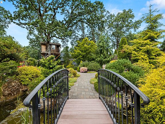 This gorgeous, one of a kind property offers a seamless blend of indoor and outdoor living spaces, creating a haven you'll never want to leave. You'll be captivated by the spacious and inviting backyard with its covered deck that overlooks a mesmerizing waterfall and pond, providing a serene backdrop for all your gatherings. The lush grassy yard is ideal for outdoor activities, complete with a fire pit for cozy evenings under the stars, a charming swing, and a breathtaking Zen Tree House accessible via a spiral staircase, perfect for meditation or a quiet escape. The interior of this home is equally impressive. The open kitchen is a chef's delight, featuring pristine white cabinetry, elegant granite countertops, and a cozy breakfast area. Adjacent to the kitchen is the family room, highlighted by a stunning stone fireplace that adds warmth and character. Formal living and dining areas offer additional room for entertaining and special occasions. The large primary suite is a true retreat, with a sitting area, a soaking tub, a separate shower, and a spacious walk-in closet. With four bedrooms plus a generously-sized bonus room or second family room, there's ample space for family, guests, or a home office. This home is packed with amenities designed for comfort and convenience. Enjoy the beauty of hardwood floors, custom tile throughout, central vacuum. New roof in 2022! The ground level deck features an outdoor kitchen and panels for enclosure, making it a year-round space. The fenced yard offers security, privacy, and a sectioned off dog area. Last but not least is a bonus shed for additional hobbies. Located in a prime area. Take a short walk or bike ride to Rivervilla Park in Oak Grove, located on the Willamette River and enjoy all the natural beauty and recreational opportunities it provides. Come view this stunning oasis.