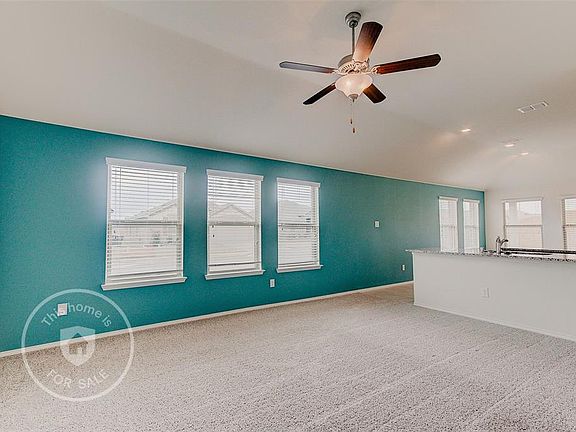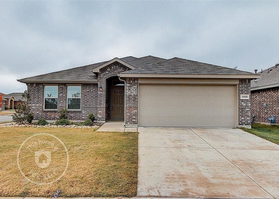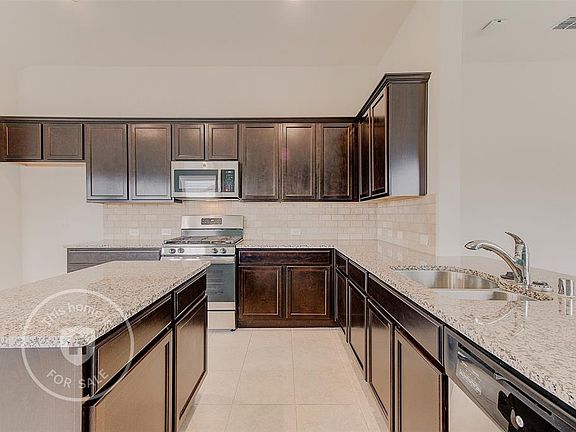 Built in 2018, this Haslet one-story corner lot home offers stainless steel appliances, granite kitchen countertops, a covered back patio, and a two-car garage.