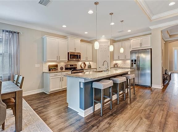 Stunning newer construction single-family home built in 2017. Home boasts a beautiful heated pool and spa, 3 bedroom, 2 bathroom, den, and 2-car garage. Open concept floor plan, gorgeous laminate floors in main living area, tray ceilings, and crown molding make this house truly spectacular. Lanai is perfect for entertaining and is plumbed and wired for a future outdoor kitchen. Situated on a corner lot and located within a gated community that is near shopping, hospitals, restaurants, and an excellent school district. Low HOA fee includes lawn maintenance!