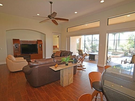 No need to wait when you can move right in to this lightly lived in immaculate upscale home behind the gates of Country Club East. Located in Leopard Creek, where your HOA fee includes all yard maintenance, this stunning home offers soaring ceilings, smooth two-panel 8' doors, a desirable great room floor plan with upgrades galore. Enjoy the tranquil setting of a cul-de-sac 11,000+ sq ft premium lot with stunning lake views from your 12'x10' heated spa and both guest bedrooms. The clean contemporary feel includes luxurious features such as fully upgraded kitchen with wood cabinets including fronts of d/w & refrigerator, a gas cook top, wall oven, decorative back splash, desk area, pantry storage, custom pendant lights & ceiling fans, and a wood look tiled floor throughout the entire home. A neutral color palette with upscale baths and coffered or tray ceilings in some areas. Glorious master suite with bay window and custom designed California closet system. An energy efficient home with icynene spray insulation, impact glass windows, recirculating HW tank, alarm and motorized sunscreen on lanai. Compare the CDD to new homes... plus have all window blinds included, keyless entry at garage door, alarm system, home warranty and so much more. Full feature sheet available.