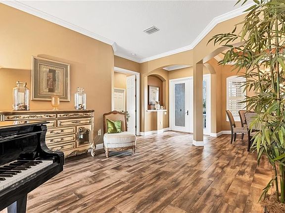 This stunning move-in ready home with 4 bedrooms, 4 baths and an upstairs bonus room has a premium private lot with lake and preserve views in sought-after Greenbrook Village. This exquisite home offers double glass entry doors that lead you into the living room with sliding glass doors to the lanai. Adjacent to the living room is a formal dining area with impressive tray ceilings and a butler's passage with a built-in wine cooler. The grand gourmet kitchen boasts granite and quartz countertops and island, wood cabinets, Thermador gas top stove, glass tile backsplash and a breakfast nook with an aquarium window. The spacious gathering room off the kitchen overlooks the pool and lanai and has plenty of room for entertaining. Sliding glass doors will lead you to the spacious lanai that offers impressive lake and preserve views while you relax by the pool and spa. The master oasis offers a seating area with a private door to the patio pool area, tray ceilings, walk-in closet, an oversized shower along with dual sinks. Make your way to the upstairs bonus room that offers a full bath and guest suite. Other notable features include a 3-car garage, storage space under the stairs, laundry room and two other guest suites. seller has an outdoor grill for the patio still in the box. Enjoy your private preserve and water views and the abundant wildlife in the community of Greenbrook.