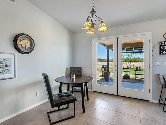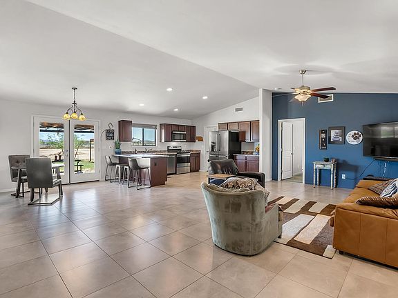 Darling Ranch home located on 1.12 acres and surrounded by Mountain Views. This 3 bedroom 2 bath split floor plan has a large master suite and bath . Enter to your spacious great room with vaulted ceilings and beautiful neutral tile . The contemporary kitchen has maple cabinets , tasteful counter tops , and stainless steel appliances. Sit at your breakfast bar looking out to Mountain Views and wide open spaces. Large laundry room with a pantry and plenty of shelving . Relax on your extended covered patio watching the sunsets. The property is completely fenced with pipe fencing ready for the pups or horses . There is a shared well and solar . The extended length garage has a wall of built in cabinets and a work bench . Come find your own kind of paradise .Bring all the toys and horses .
