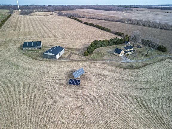 A farm enthusiasts dream, this private 5-bedroom, 2-bathroom home blends country charm and modern convenience. Nestled on 4 acres, it offers peace, quiet, and breathtaking views with glimpses of water on clear days. Heated with a heat pump and propane backup, it keeps hydro costs low. Inside, hardwood floors and natural light create a warm, inviting space, while a wrap-around porch is perfect for relaxing. The property includes a 48 x 72 ft pole barn with a partially insulated shop and a 40 x 64 ft barn with stalls and storage both with hydro and water. Ideal for hobby farmers or those looking to expand. With direct access to Highway 3, this home offers rural tranquility.