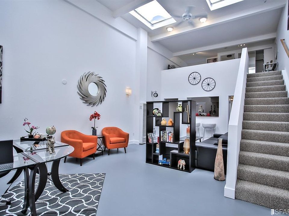 This West Oakland loft is designated as live/work and boasts an open floor plan. The 2001 warehouse conversion with soaring ceilings offers rooftop natural light. Enter through the front door into a generous work/meeting space that transitions to a comfortable area for socializing. The downstairs half bathroom is perfect for guests, and storage under the stairs can park a bicycle. A bar style counter separates the kitchen which offers a dining area, stainless appliances, ample cupboards and in unit laundry. Upstairs opens to a mezzanine bedroom with a full bathroom and closet. Fresh paint throughout makes this coder's haven an easy option, with deeded, garaged parking, and a few blocks to BART for complete commuter living.