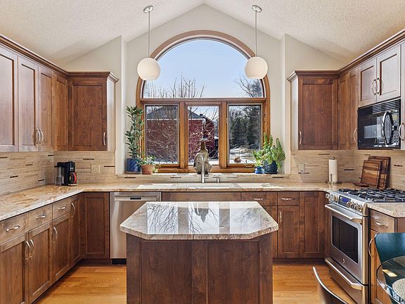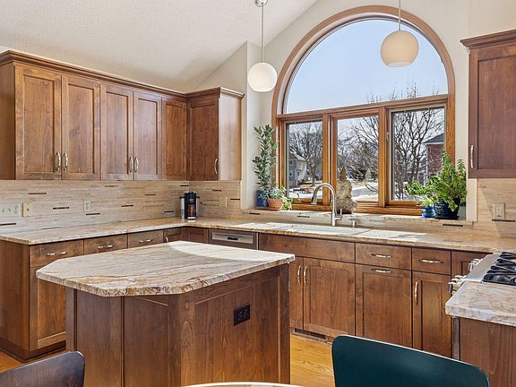 Fantastic multi-level Eagan home loaded with updates available for the first time. The remodeled kitchen is at the front of the home with vaulted ceilings, custom cabinets, granite counters, stainless appliances, large center island and casual dining nook. Adjacent to the kitchen is the separate dining room with access to the deck for additional dining and grilling options. Upstairs you’ll find a generous living room with vaulted ceiling and windows to the backyard. Through a pair of French doors is the den with wet bar, a space that provides flexibility for whatever you need – office, library, or even a guest bedroom. Also upstairs, you’ll find a primary suite with walkthrough full bath and a 2nd upper level bedroom. The walkout lower level features a sizeable family room with gas fireplace, 2 more large bedrooms and a 3/4 bath. Bonus basement space holds your mechanicals and laundry, plus loads of storage / work space. 2 car garage. Hardie board and brick exterior plus a new roof in 2024! 9 zone irrigation system, wrought iron fully fenced backyard. Enjoy the yard from the lovely deck off the side of the home or the massive paver patio off the family room. School District 196! Home has been pre-inspected.