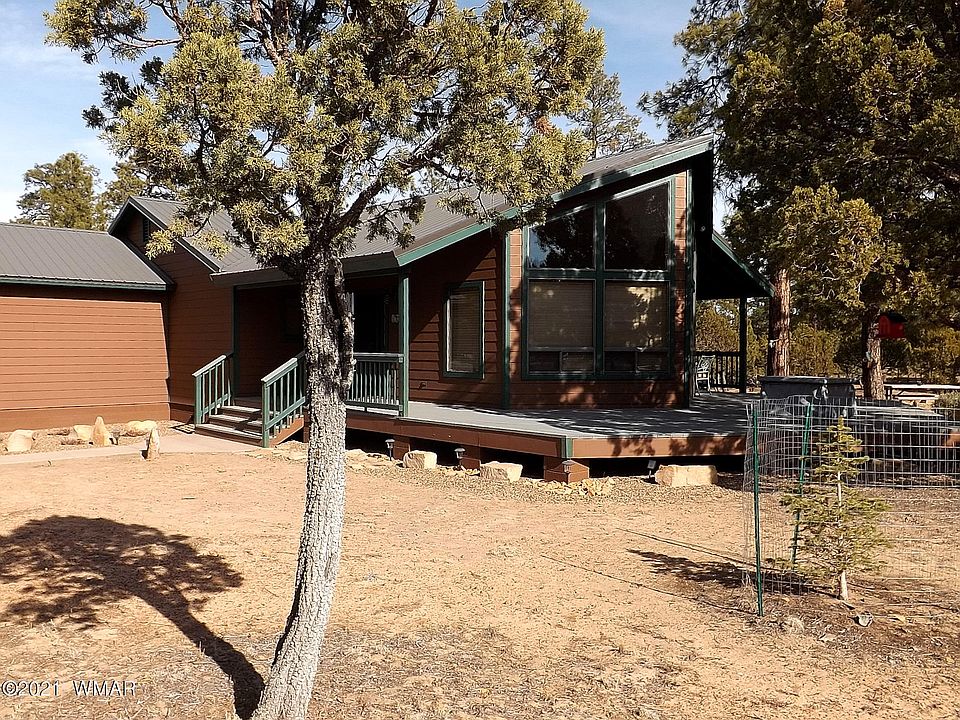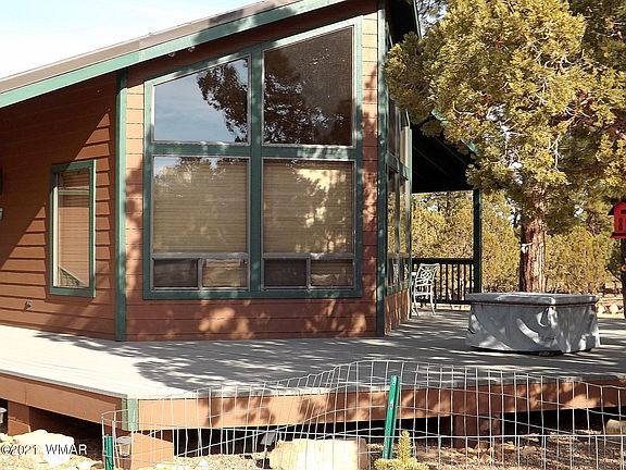 An impeccably maintained single level 3 BR/2 BA 1465 SqFt Chalet in the coveted High Country Pines Two area in Heber AZ. This wonderful home features a great room design with a wall of windows, freestanding fireplace, T&G vaulted ceilings, travertine tile and carpeted flooring. Upgraded kitchen cabinets, laundry room with washer and dryer, central heat and AC, security system and generous sized bedrooms. The exterior boasts low maintenance color lock siding, 3/4 wraparound deck, attached 2 car garage and a metal roof. High Country Pines is serviced by a private sewer (no septic). This beautiful chalet is situated on a .81 acre heavily treed corner lot and is expertly maintained. This home is turn key and comes furnished.