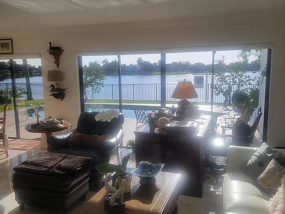 Be immediately greeted by a stunning lake view from the front door of your all ages, non-HOA, 4 bed/3 bath, pool home in an excellent school district. The gorgeous view can also be admired from the kitchen, the living room, the dining room, the master bedroom, the private pool (with a cabana bath) plus potentially a dock (which is permitted) and your boat. The open layout provides an airy, bright feel with the kitchen open to the living room/dining room. The kitchen and wet bar are finished with luxurious quartz countertops, a tiled backsplash, white cabinetry, under cabinet lighting, high hat lighting and stainless steel appliances including a gas range. The living area is upgraded with 24'' porcelain tile underfoot, crown molding and a working, cozy fireplace. At the end of the day, retire to your master bedroom with direct access to the pool through classic French doors or the cabana bath. The master bathroom boasts dual sinks, a separate tub and shower plus a large walk-in closet. The guest bathroom is conveniently located between the two guest bedrooms and is upgraded in granite, rich wood cabinetry and stylish tile. There is an abundance of storage space in the attic (the roof is only 1 year old) which can be optionally converted into a bedroom. Venture to the laundry room and you will find it very spacious with a full-sized washer and dryer, a sink and lots of storage. You will find a tankless water heater in the two car garage. Outside, the enclosed, fenced-in yard affords a secure area for people and pets to run around and play in. The extended patio is ideal for entertaining guests while you are grilling and they are relaxing, sipping on a drink. The very large lake offers so much, including gorgeous sunsets, a boat parade (you have a front seat to it and you can take out your own watercraft!) plus you can fish (the lake is stocked). The Aquatic Center is nearby, so is shopping, entertainment and of course the Wellington Equestrian Center. Please arrange a tour to see for yourself!