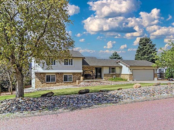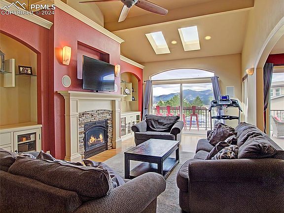 Panoramic front range views of the mountains and Pikes Peak. This tri-level home is located on a quiet cul-de-sac lot in the popular Gleneagle area surrounded by trees and abundent wildlife. Bright and open concept home with an upgraded gourmet kitchen, 5 burner gas cooktop, walk-in pantry, granite countertops, stainless steel appliances, hardwood floors and walks out to a composite custom deck. Open style living room with built-ins, gas fireplace with stacked-stone surround, surround sound, and skylights. The primary suite has a separate sitting area that walks out to your private deck, connects to the 5 piece primary bathroom, and 2 walk-in closets. The lower level family room has a wood burning fireplace, and 2 additional bedrooms, wetbar, and 3/4 bathroom. Main sewer lines has been replace (June 2024).