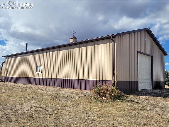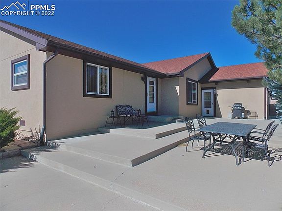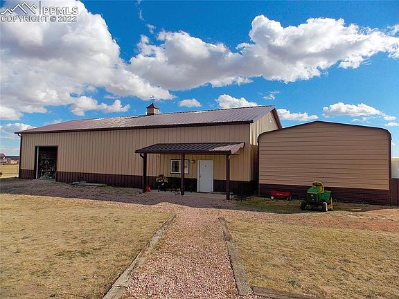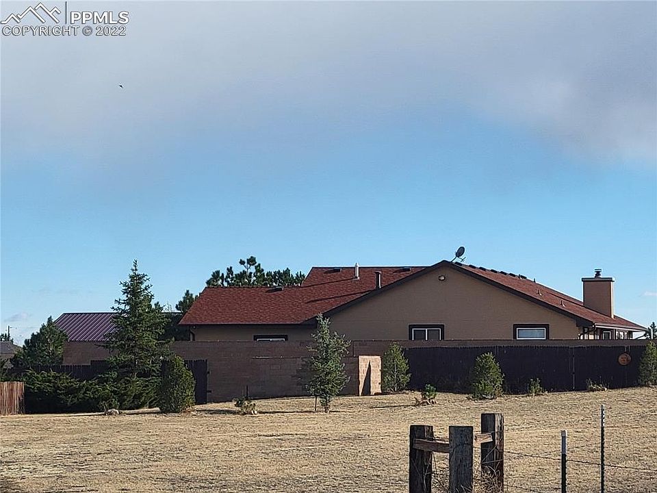 Your sanctuary awaits you: One level Rancher on almost 6 acres is close in, yet worlds away from the hustle and bustle. Just minutes from the Falcon Safeway and other businesses, this one owner property has so much to offer. One level living with 4 bedrooms plus an office, 2 1/2 baths, vaulted ceilings, hardwood floors, Newer Furnace & Air Conditioner, newer Roof, and newer Stucco. There are many different entertainment and work areas. The enormous 75'X32' Steel building will hold nearly anything you like. It has several built-in storage closets, skylights, 2 overhead doors (13' and 10 ') and a wood stove and a huge flat screen TV that is included. The ULTIMATE MAN SHED! Another 20'X30" steel building with an overhead door sits next to the big building, plus there's a She Shed nearby that has heat and electric in it. The current owner has built a shooting range that complies with local ordinances. There's a garden area, playground area, etc. Electric gate with remote. This property is a must see with so many unique improvements. There are many mature trees (100+) Another plus is the Natural Gas from Colo Springs Utilities which is more economical than propane. Located at the end of a Cul De Sac with easy access to Meadow Lake Airport. Zoned for horses and 4-H projects of any type are okay. Mobiles aren't allowed, but Modulars are. No Active HOA!!!Yay! See this property today. Homes do not often come up for sale in this great subdivision.