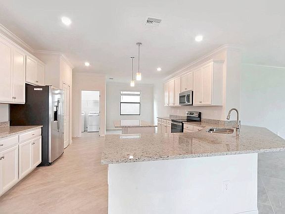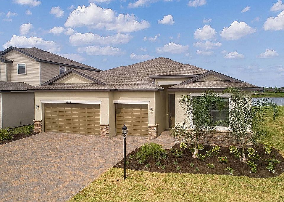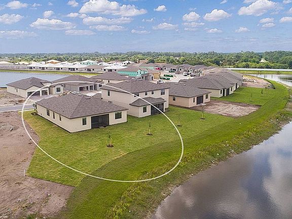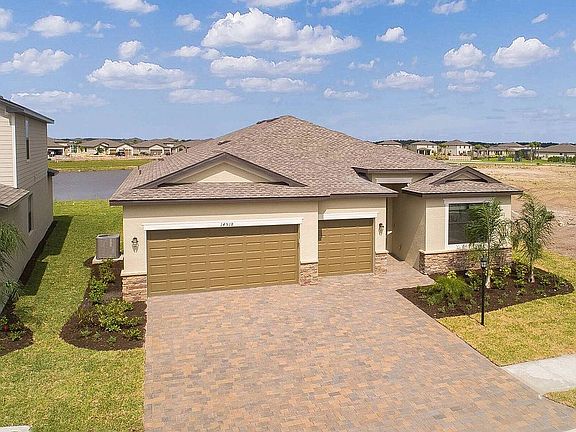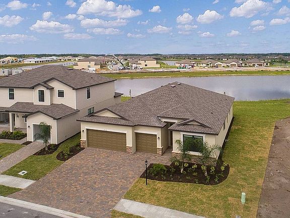 *Buyer Broker 3%* *Virtual tour available* This beautiful lakefront Tivoli model has an open floor plan, with 2,271 square feet of living area, complete with 4 bedrooms, 3 full bathrooms, and a 3-car garage. The spacious island kitchen has substantial granite countertop space, breakfast bar & nook and seating for plenty, a generous food-prep area, wood cabinets with lots of storage, stainless steel appliances and large pantry. The adjacent dining room is expansive enough for large gatherings. The living room features an open concept, complete with crown molded volume ceilings and lakefront sunset views. Stately master bedroom suite is bright with natural light, features high ceilings, large walk-in closet and crown molding throughout. The master bath features dual sinks and a large walk-in shower. Upgrades include diagonal tile throughout the house, crown moldings, paver driveway and lanai, exterior brick finishes, voice-activated Smart Home system, garage epoxy floor finish. The home overlooks the lake and have plenty of space in the back to add a pool and entertainment area. Low HOA dues with access to community pool & clubhouse, large state-of-the art fitness center, landscaping & lawn maintenance. Under air 2,271 sf Garage 590 sf Porch 176 sf Total 3,037 sf Directions to home: Entering community you are on Portico Boulevard, make right on Palamos Cir, make right on Carva Lane, then it's first house on the right
