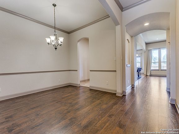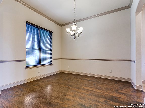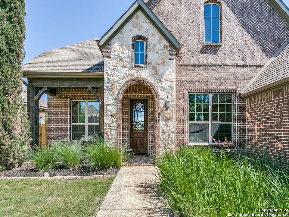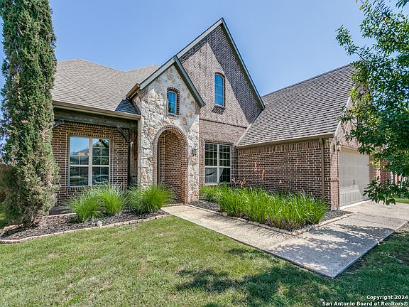 Lovely two-story home nestled in prestigious Kallison Ranch! Greenbelt lot for ultimate privacy! Timeless elegance with brick exterior and charming brick front porch! Custom finishes throughout with arches, high ceilings, crown molding, chair rails, tall baseboards, art niches, paneled interior doors! Warm hardwood floors cover 1st floor living! Spacious kitchen island! Gas cooking! Cozy fireplace w gas logs! All bedrooms downstairs! Second family room upstairs with full bath! Numerous closets! Backyard features covered patio, gas barbecue, flagstone walk & firepit area with storage shed and greenbelt! Convenient access to schools and a variety of neighborhood amenities including 2 pools and a fishing pond!