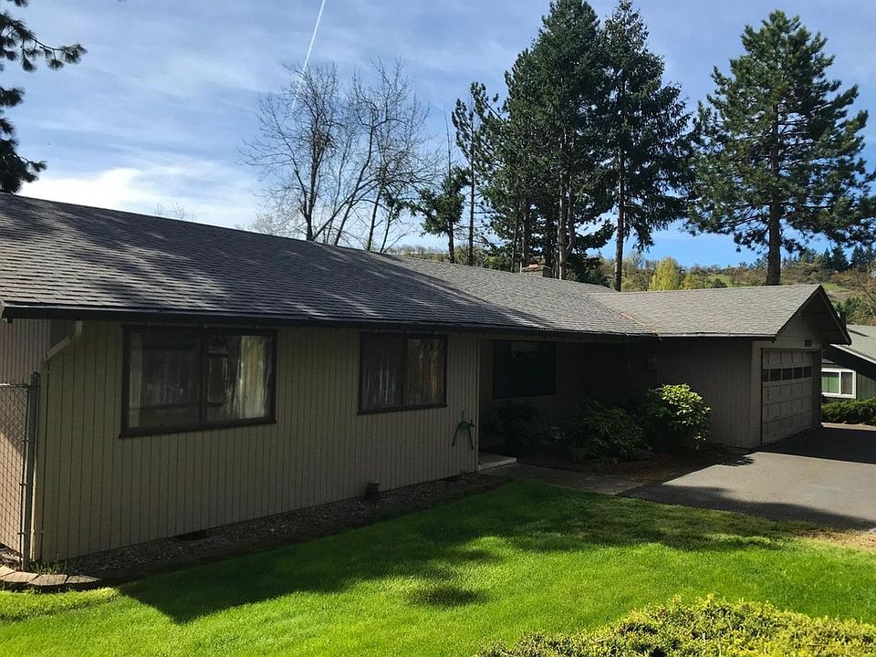 This single level home in East Medford features 3 bedrooms, 2 baths, living room plus a family room with a brick fireplace and French doors leading to the large Trex style deck with custom railing, garden area, mature trees and foliage. Seller states there are some recent updates including a newer heat pump, some of the rear windows and the roof was replaced a while back. There is even some room for RV parking. Home sits on flag lot off Angelcrest Dr.