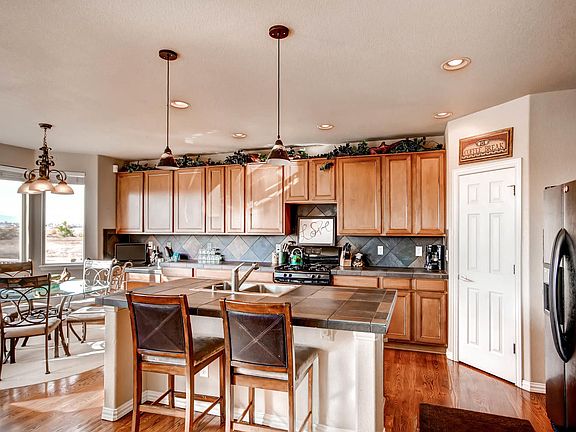 Beautiful Mountain Views from the back deck, sunset views over the flatirons, and backs to open space! Location is everything for this home. Trex deck with red stone patio below, walk out basement, large covered front porch to enjoy the outdoors. Hardwood floors in the entry, dining room and kitchen. Open kitchen with island overlooking the family room, tile counters and back splash, 42 in cabinets, gas stove, and appliances included. This home includes a living room, dining room, family room, study on the main floor, double sided gas fireplace, master bedroom with views of the mountains, 5 piece master bathroom with walk in closet, loft area, 2 spare bedrooms and a flex room that can be converted into a bedroom if needed. Full unfinished walk out basement, 3 car garage, St. Vrain School District, 10 minutes to I-25, Vista Point Golf course community, and walking trails out your back door. This home has it all! Short Sale, Sold AS-IS
