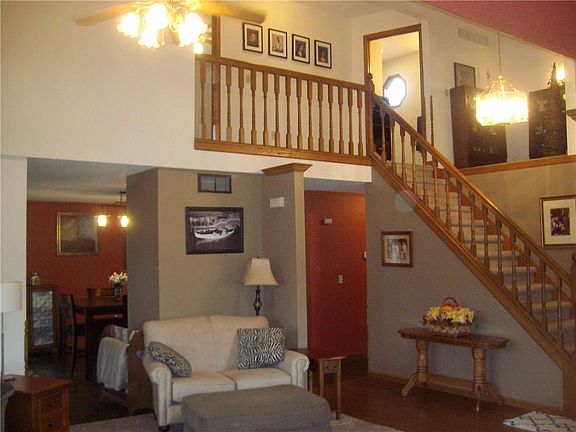 Move in ready home in a great neighborhood! Priced to sell quickly! Open stairway to the second floor. Spacious great room with vaulted ceiling. Plenty of oak cabinets in the kitchen. Breakfast bar. First floor master bedroom features a walk in closet and en suite with shower and whirlpool tub. The second floor offers two bedrooms and bath. The finished basement has a family room and two more rooms the sellers used as bedrooms. The pool table is included. Back up sump pump. Roof is 2 years old. New Furnace. Heated 2 car garage has hot/cold water. Utility shed. Wood deck.