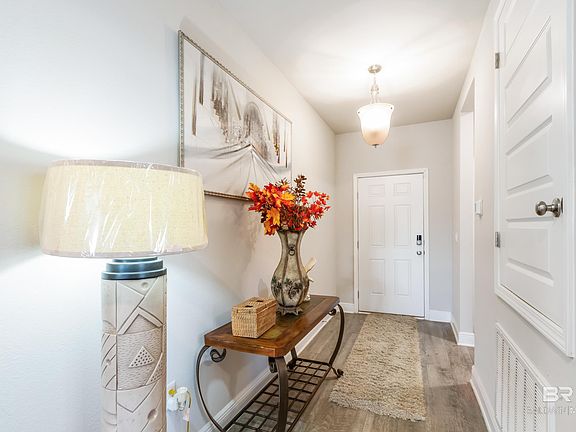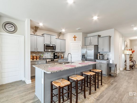 This stunning GOLD FORTIFIED all-brick property is a Bristol plan in the GATED subdivision of Ethos. The open-floor concept has a large kitchen island with a breakfast bar, stainless steel appliances, custom backsplash, and soft-close 'Pebble Gray' painted cabinets. The kitchen and bathrooms feature granite countertops, and the canned lights in the 9' ceilings add a feeling of spaciousness. Luxury vinyl plank flooring in the living area, and plush Mohawk carpet in the bedrooms. The primary bedroom is at the rear, and the ensuite bathroom has a dual vanity and a fully tiled shower. From the dining area, step into a covered porch, conveniently wired for a ceiling fan, and leading to a fenced backyard. For added security, the house features 'Smart Home' Technology. Ethos was built for an 'active lifestyle' with pedestrian walkways, a generous pool, and pickleball courts. The HOA dues include lawn care service, and pool and pickleball court maintenance. Located minutes from the heart of Foley, there's easy access to many stores and restaurants, and also the Beach Express. The property is a second home. Buyer to verify all information during due diligence.