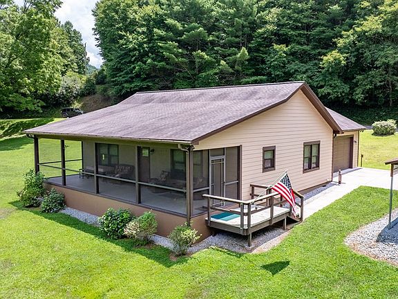 Rare Creek Front property with a total 3.46 LEVEL ACRES of Pasture Land that borders 800' of Middle Creek. This home is roughly 8 miles South of Franklin, NC. The exterior is nearly maintenance free, and includes Hardie-Plank siding with aluminum fascia & soffit. Exterior has been painted with 2 coats of Sherwin-Williams duration paint. Front porch overlooking the creek is completely screened. House is comprised of 2 x 6 framed walls, 9 ft high, vaulted ceiling in kitchen and great room. All windows, including garage, are double pane thermal. This home, including garage is dry walled with "knockdown texture" & "smooth corners". There are Laminate floors throughout house except bathrooms which have ceramic tile flooring. The Garage has completely insulated walls & 10' ceiling. 8 ft high garage door. Well is 305 ft deep, 30 gallons per minute output. Thomasville oak cabinets - all wood. Granite countertops. Ceiling fans throughout house, including front porch and bathrooms. Comfort height toilets. 36 inch vanities in bathrooms. All appliances and furniture are INCLUDED in this listing.