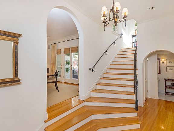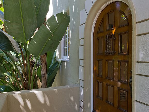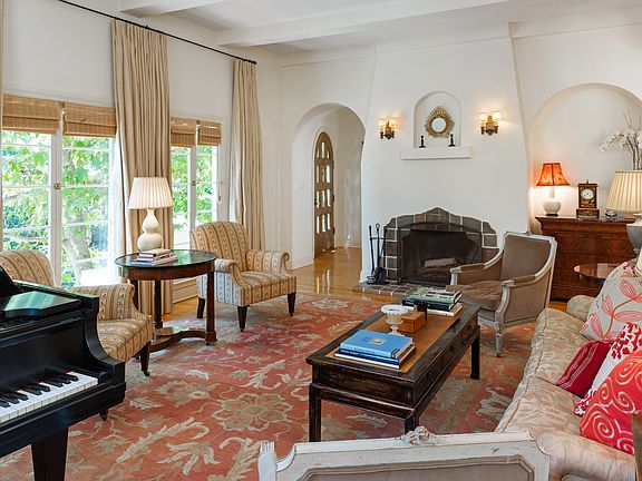 Set just above the iconic Sunset Strip, this beautiful Spanish home exudes warmth and style. The upstairs master suite overlooks city lights, with a separate and private junior master suite, a cozy library walled with bookshelves and opening to a private patio. A wonderful floorplan offers an abundance of natural light throughout, with high ceilings, French doors, and beamed ceilings. Beautifully landscaped terraced gardens and a grassy yard.
