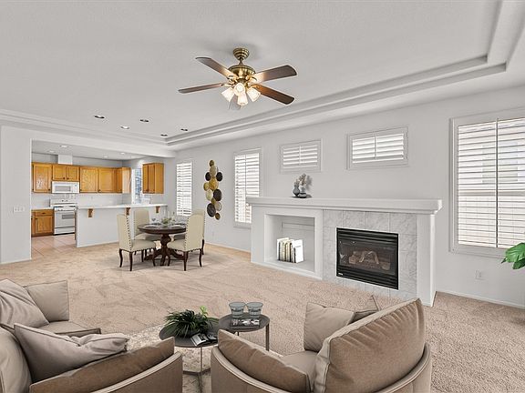 Welcome to beautiful Sun Lakes Country Club, a premier active adult 55+ golf community! This popular single story model boasts two bedrooms, two bathrooms PLUS an office/den with custom doors that can be used as a third bedroom. This home features an open concept kitchen-living room layout with a neutral color palette. Recent updates include NEW carpet and FRESH paint throughout. Additional highlights include vaulted ceilings, indoor laundry, and a two car garage with golf cart included! The backyard features an alumawood patio cover, fruit trees and a low maintenance landscape. Sun Lakes Country Club is a gated community with 24 hour security. Cable TV and high speed internet is included in the HOA fee. Generous amenities include two 18 hole golf courses, multiple social clubs, club houses, restaurants, a cocktail lounge, tennis courts, swimming pools, fitness centers, pickleball courts and more.