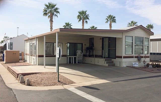 Resort Park Model home on Great Corner Lot with Traditional AZ Room. Carpet & Vinyl Flooring. Open Floor Plan with Kitchen and Living Room combined into One Room. Kitchen has Microwave, Fridge/Freezer, Full Size Stove, Storage and Dining Bay. Queen Bedroom with Storage under Bed and Large Mirrored Closets as well as Built-In Dresser and Book Stands. One full Bathroom with Tub and Shower. AZ Room can be used for a Bedroom, Living Room or an Extra Miscellaneous Room of Your Choice. Half Bathroom, Closet and Laundry Room with Storage in this Area. Double Carport Parking Area with side patio. Furnished. Washer/Dryer. Central A/C & Heat.