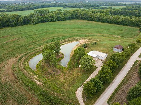 Located in the southwest corner of Johnson County, MO, between Kansas City and Clinton, is this incredible 40-acre offering. A dynamic mix of farm ground, woods, live creek, and improvements, the property has something for everyone. 26 acres of tillable ground, currently planted in soybeans, are rented by a local farmer and provide yearly income. The farm is home to deer, turkeys, and other wildlife, making for terrific hunting. With frontage on Big Creek, the farm has fishing, as well as tremendous potential for building a wetland. A long clearing between the old railroad bed and the creek is an excellent location for habitat development for waterfowl or whitetails. With sloping topography, the improvements are located on the hill, offering spectacular panoramic views overlooking the Big Creek bottoms. A new pond has been constructed beside the building and is still filling. 750 sf of the 30x50 metal building have been remodeled into beautiful living quarters, perfect for hunting camp and/or family getaway. The living room furniture will convey with the sale. The other half of the building offers adequate parking and storage for equipment and toys. A new covered wrap-around patio has been added, and is the perfect place to kick back and enjoy the view of the pond and surrounding scenery. The old 20x30 hay barn has power and water, and would be an ideal location for building a home. The farm is just ¼ mile from blacktop B Hwy, and is located within the Holden School District.