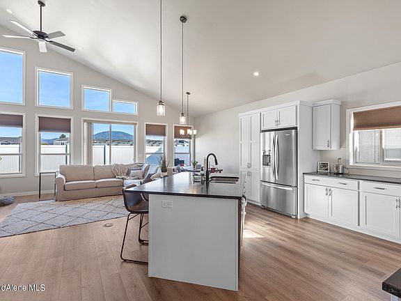 This stunning residence showcases a modern and spacious floor plan that is an absolute must-see. Boasting high ceilings and an open concept design, this home offers a seamless flow and an abundance of natural light throughout. Best of all, there are no steps, ensuring ease of access and a comfortable living experience. Step inside to discover 1622 square feet of thoughtfully designed living space, featuring 2 bedrooms, 2 baths, and a versatile flex room that can be customized to suit your needs. The layout is perfect for both everyday living and entertaining. The home's design extends to the outdoor areas as well. You'll love the rear patio, ideal for hosting barbecues or relaxing. The property is fully landscaped with a sprinkler system and the rear yard is fenced. Convenience is key with this property, as it is situated in a highly desirable location, offering easy access to amenities, shopping, dining, and entertainment options. You'll find yourself just moments away from everything Coeur d'Alene has to offer.