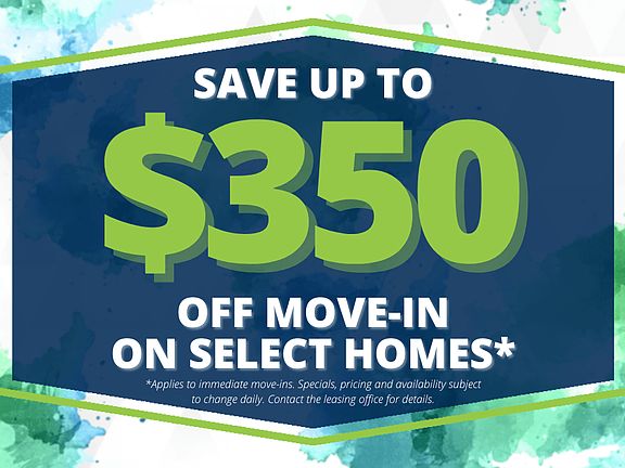 - Special offer! Save up $350 off move-in on select homes! *Applies to immediate move-ins. Specials, pricing and availability subject to change daily. Contact the leasing office for details.