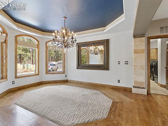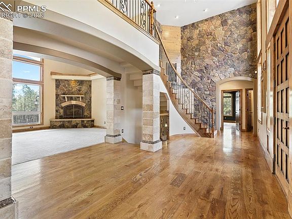 This luxurious 5 acre property boasts 6 beds, 6 baths, and a 6-car garage, all set on a stunning 5-acre treed lot. With over 6,200 sq ft of living space, this home offers ample room for comfortable living and entertaining guests. The property features high-end finishes throughout, stone interior, custom lighting and surround sound. Entering, you are greeted by gorgeous wood floors, an open entry with custom lighting, open rail staircase, formal dining room, and water fountain feature wall. The gourmet kitchen is equipped with stainless appliances, beautiful granite counters, large kitchen island, pantry, wine fridge, and eat in area complete with walk-out to the back concrete deck. Finishing out the main level are the formal dining room, living room with gas fireplace, a large primary suite with sitting area and double sided gas fireplace to the office, 5-piece master bath, large jetted soaking tub, stunning walk-in shower, double vanity, and walk-in closet, a second bedroom with water connection (think home business ie: hair salon) with exterior access, two half bathrooms, a well-appointed laundry room with dog wash, laundry sink, and mud room with built in cabinets that enters the main level 3 car garage. Make your way upstairs to find two large bedrooms with Jack and Jill full bathroom and loft area (make note of the stunning waterfall on the way up). Head downstairs to the finished walkout basement to enjoy the large rec/family room with gas fireplace, wet bar, theater room (with high end theater equipment) additional large bedroom with adjoined full bathroom, large second bedroom and 3/4 bath, and extra storage. Access the finished and heated lower 3 car garage from the basement. Enjoy the peaceful surrounding landscape from the outdoor living areas to include large concrete patio, and outdoor fireplace perfect for entertaining on those gorgeous Colorado nights. This is the perfect oasis for those seeking both privacy and luxury with close access to amenities.