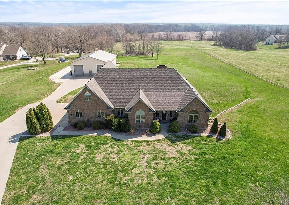 This stunning all brick home setting on 5+ acres m/l is a MUST SEE! With almost 6000 finished sq ft.There are 4 conforming bedrooms with 2 non-conforming-used as offices. The minute you walk in the front door the openness says: "I'm Home." Offering beautiful cabinets, detailed trim work, formal dining, 2 gas starter fireplaces, a main level master suite & so much more.The finished walkout basement has a HUGE rec room & 2nd kitchen. Too many upgrades to list them all! The 50X60 outbuilding is amazing. Great Location! Just outside city limits, yet close to the schools. Peaceful backyard w/ beautiful view.  Low maintenance composite deck. 50 X 60 insulated outbuilding with tall wide doors, remote entry, and loft area for additional storage.