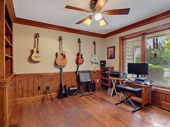 - Ceiling Fan(s), Crown Molding, Bar, Built-In Speaker System, Chair Rail