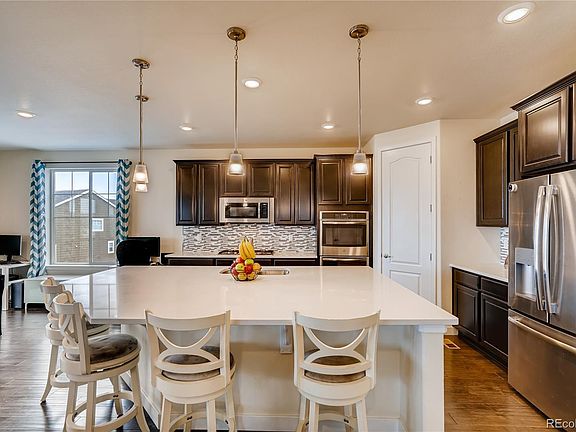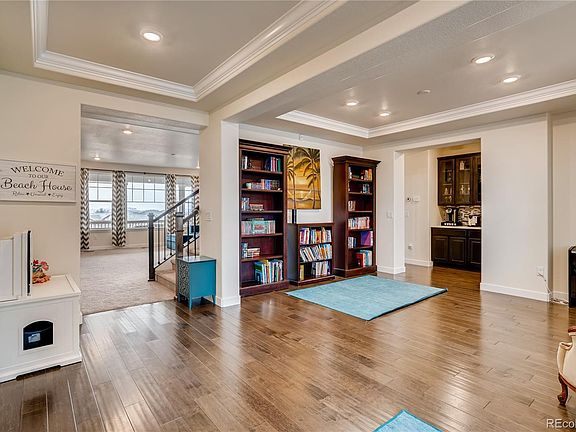 Fantastic Prescott Model from the Grand Collection built by Lennar in the Sierra Ridge community. The location of this lot within the neighborhood cannot be beat. Large lot that sits high atop with mountain views from the extended, covered deck and second story. The oversize backyard that is adjacent to a walking path and open space gives an open feel with great space to play or garden. The front porch separates an attached 2 car garage and a bonus attached, separate third car garage. Inside, you will find a spacious entry brings you to formal dining room, cozy family room with gas fireplace and gourmet kitchen. The open concept kitchen boasts a giant island perfect for entertaining large groups of friends and family, butlers pantry and separate dining room space. The kitchen opens up to the covered deck with retractable sunshades. In addition, on the main floor, there is a separate study, powder bath, mudroom and a bedroom with en suite full sized bathroom. Upstairs, this home has the Game Room option that provides a perfect TV or play space, three generous sized bedrooms, two full sized bathrooms (one jack and jill, one en suite), master bedroom with a luxurious five piece master bath and large, walk-in closets. High end upgrades throughout, custom wood shutters and numerous energy efficient features (including solar). Walk out, unfinished basement allows for another nearly 1800 SF of space to finish out and grow into. Full professional landscaping in both front and backyard. Sierra Ridge has newer community with a club house, pool and pocket parks with walking paths throughout. Conveniently located a short drive to both I-25 and C-470. Don't miss your opportunity to call this Parker home yours!
